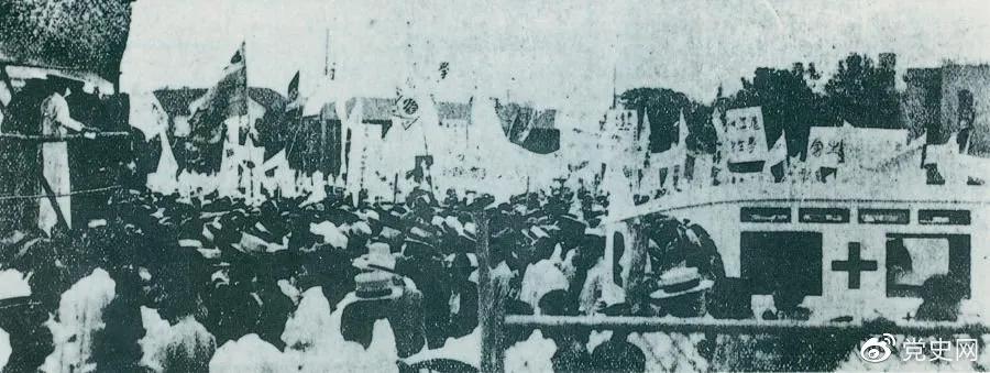 1925年6月7日,中国共产党通过上海总工会联合上海学生联合会、上海各马路商界联合会等,成立了上海反帝运动的领导机关——工商学联合会。11日,在该会的主持下,上海20万群众集会,通过了逞凶、赔偿、取消领事裁判权等17项对外交涉条件。图为大会盛况。